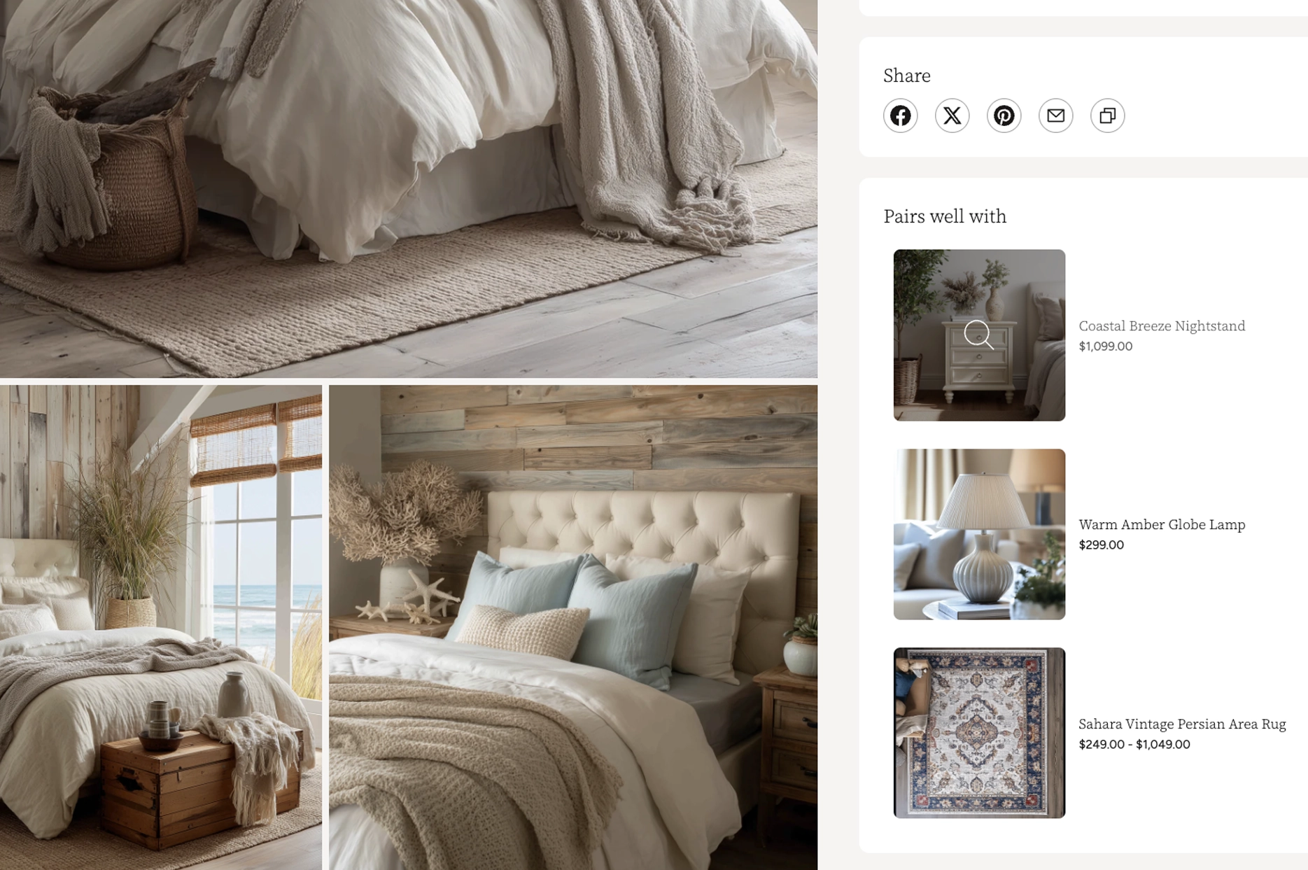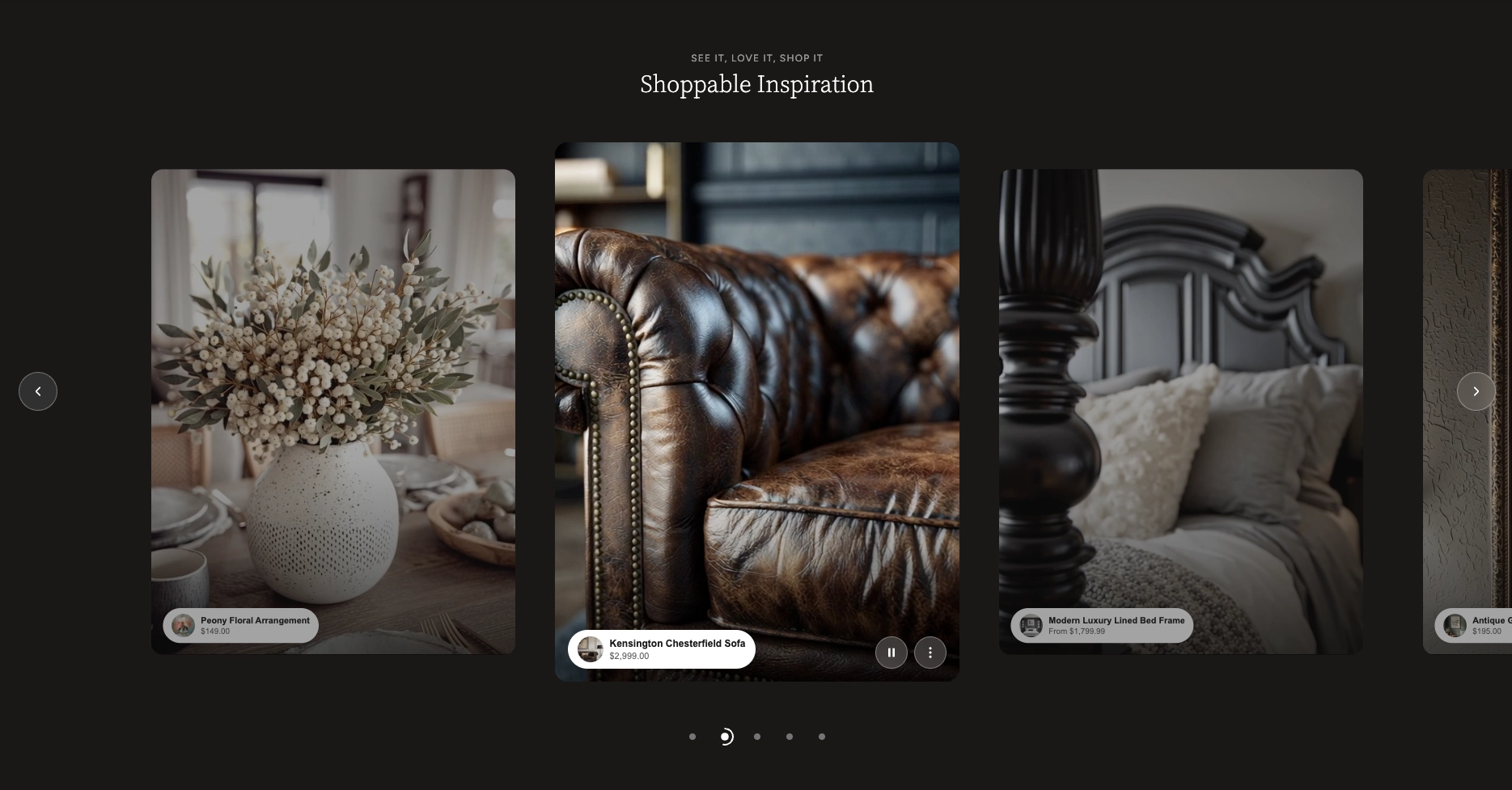 The carousel supports autoplay, auto-advance, and fully customizable card styling. Whether it's a lookbook, studio tour, or styled vignettes, every video becomes a point of sale.