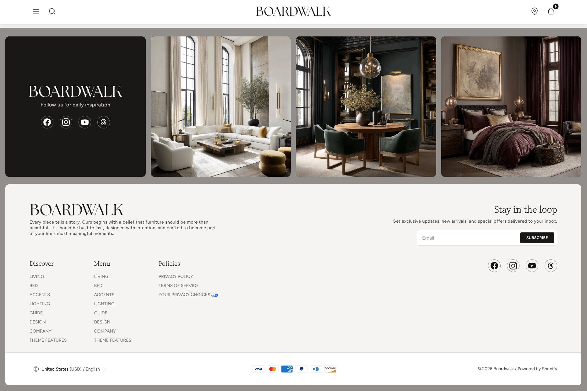 Explore BoardwalkBoardwalk is a premium Shopify theme for brands that refuse to compromise between aesthetics and performance. Built for visually driven brands in fashion, home, lifestyle, and beyond, it combines editorial-grade design with deep merchant-facing flexibility.